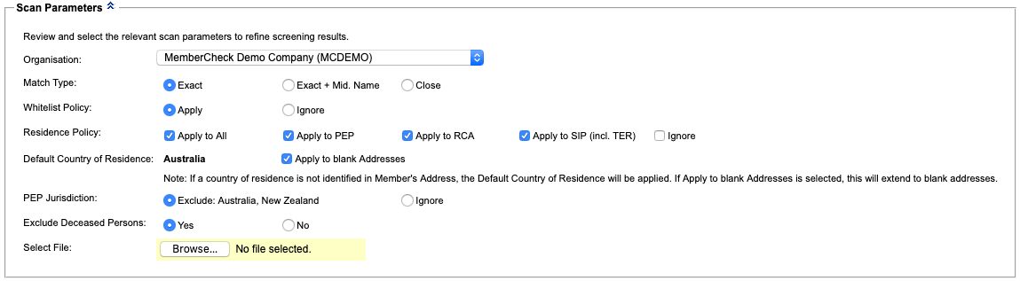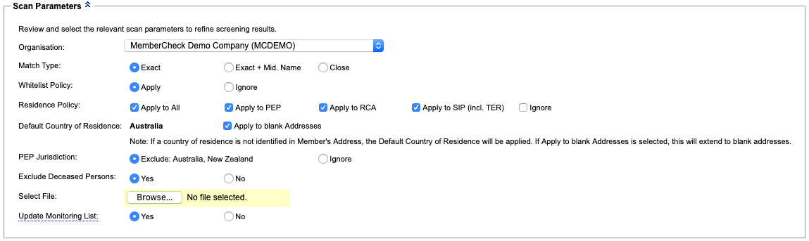 The Compliance Officer can set a default Country of Residence, to be used during member scans, where a Country is not identifiable in the member's address.