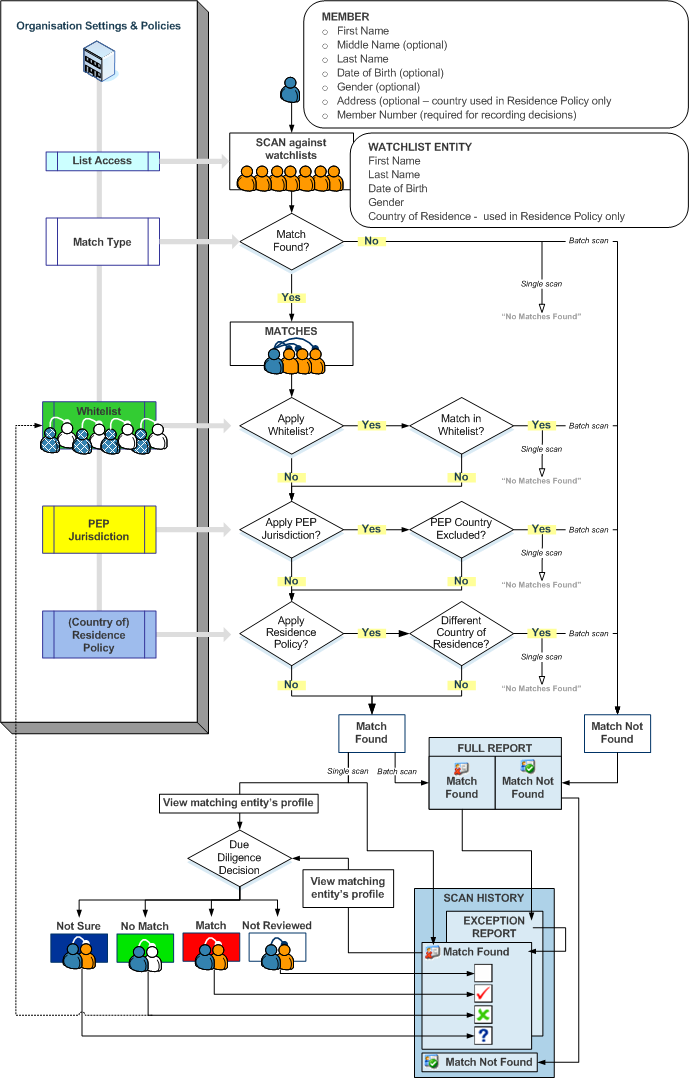This diagram shows how the scan settings and policies are used to optimise the member scanning process and eliminate false matches.